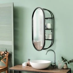 Head West, Inc. Black Metal Framed Oval Vanity Wall Mirror With Shelves – 15″ X 30″