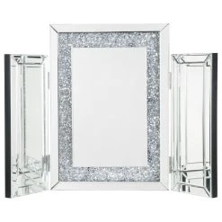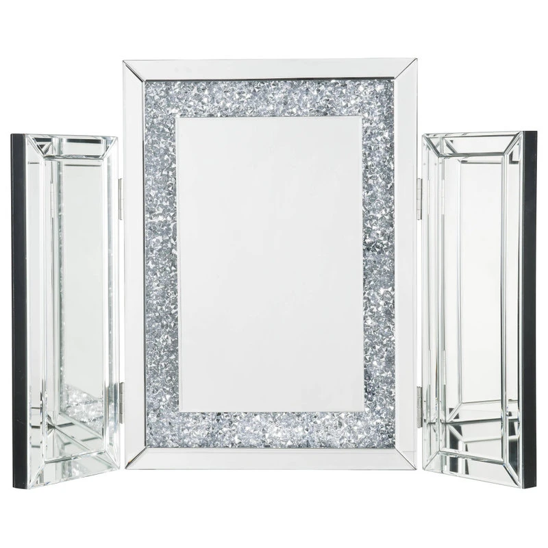 Display your dazzling sense of style by topping your vanity with the Noralie tri-fold mirror. This trifold mirror features a beveled mirrored frame with faux diamonds inlay. Each piece is hinged, allowing you to adjust the position of the side panels.