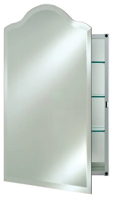 Keep your toiletries organized and hidden from view in the Frameless Mirrored Bathroom Cabinet. This scalloped-top cabinet opens to reveal three tempered glass shelves, providing you with handy storage right above the vanity. Enhance your bathroom with this stylish and highly functional piece.