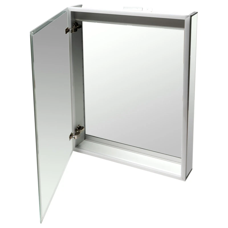 Energy efficient 6000k LED lighting strip. Single left swinging door with mirror on both sides. High quality aluminum cabinet body covered with mirrors inside and out. The defogger and the light turn on/off together on the same switch. So if the light is on, the defogger will be on as well.