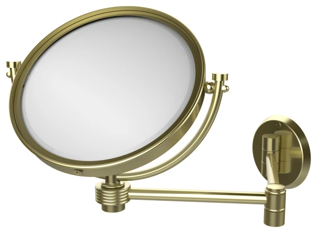 Add this stylish makeup mirror to your bathroom decor for an elegant touch. Makeup and shaving mirror pivots and tilts to allow for complete versatility in viewing angles while extending up to 14 Inches. Mirror is made from the finest solid brass materials. 8 inch double faced mirror features clear magnification on one side.