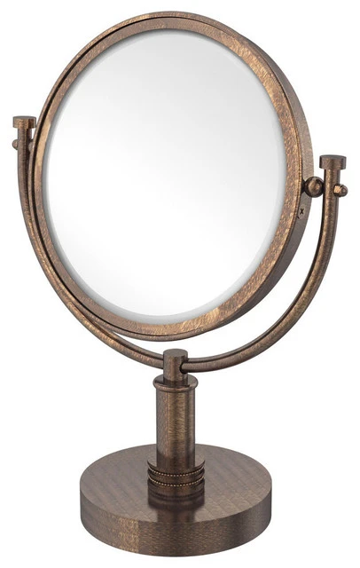 Add this stylish makeup mirror to your bathroom décor for an elegant touch. Makeup and shaving mirror pivots and tilts to allow for complete versatility in viewing angles. Overall Heigh of the mirror is 15 Inches. Mirror is made from the finest solid brass materials. 8 inch double faced mirror features clear magnification on one side.