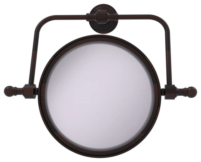 Add this stylish wall mounted makeup mirror to your bathroom decor for an elegant touch. Makeup and shaving mirror pivots and tilts to allow for complete versatility in viewing angles. Mirror is made from the finest solid brass materials. 8 inch double faced mirror features clear magnification on one side.