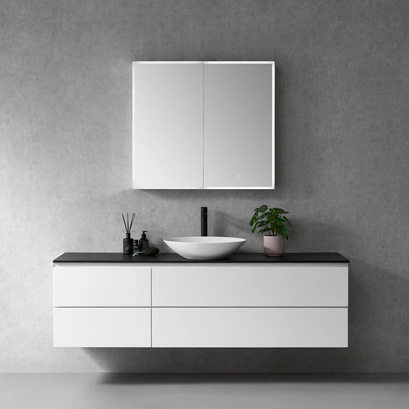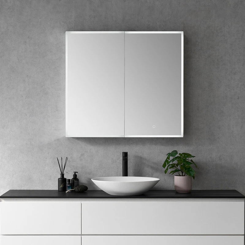 - Double-sided mirror door conceals 3 height-adjustable glass shelves.