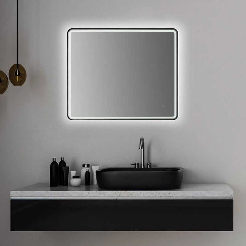 - 5mm-thick, copper-free silver mirror with frost band and acrylic black frame provides corrosion resistance and vibrant reflectiveness.