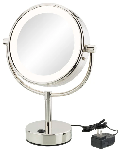 Like its wall-mounted counterpart, the NeoModern LED Lighted Mirror is certain to brighten up any counter. With its 1x/5x magnification 9″ diameter mirror, and standing 15″ tall, it has the versatility to fit any space. The bright LED lighting is low energy and virtually maintenance free. Available in two light colors and four finishes.