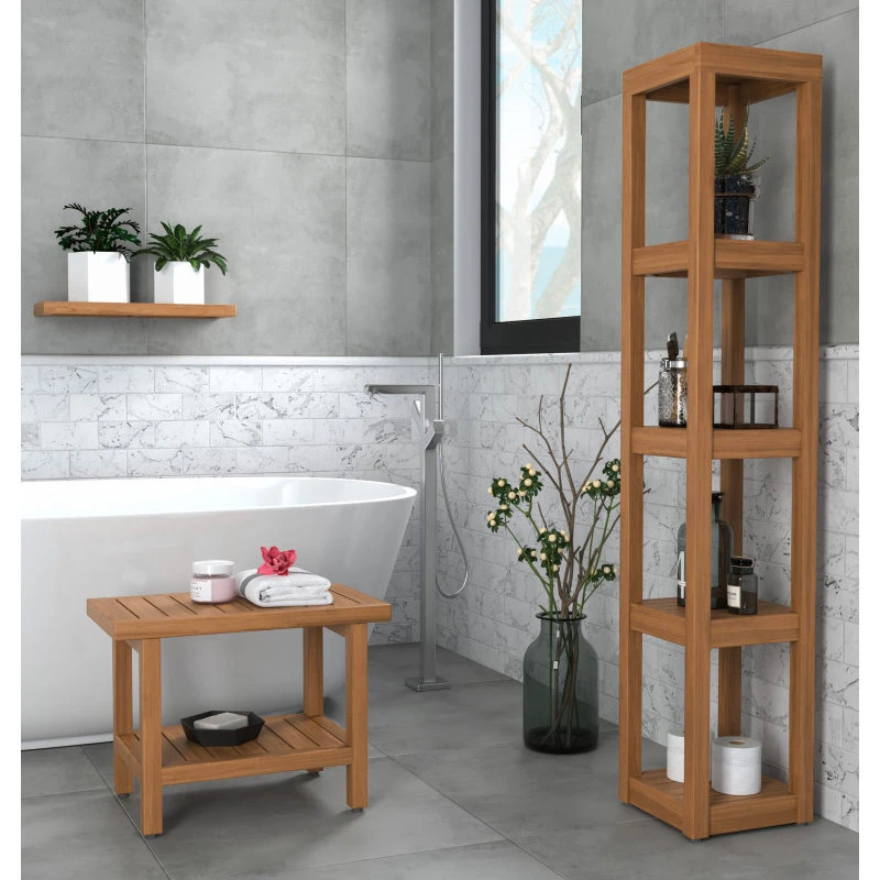 This teak shower bench will blow you away with its high quality and aesthetic appeal. Handcrafted with farm-grown, sustainably-harvested teak wood, this AquaTeak® teak shower seat is the ideal accessory for your bathroom, patio, or poolside. Convenient for use as a teak bath stool as well, this durable product comes with all stainless steel hardware and is naturally water resistant. Perfect for any area of your home or garden, we are so confident that you will love your teak shower bench that we offer a no-hassle, 30-day guarantee and a 5-year warranty on this and all of our teak furniture products! (Some assembly required)