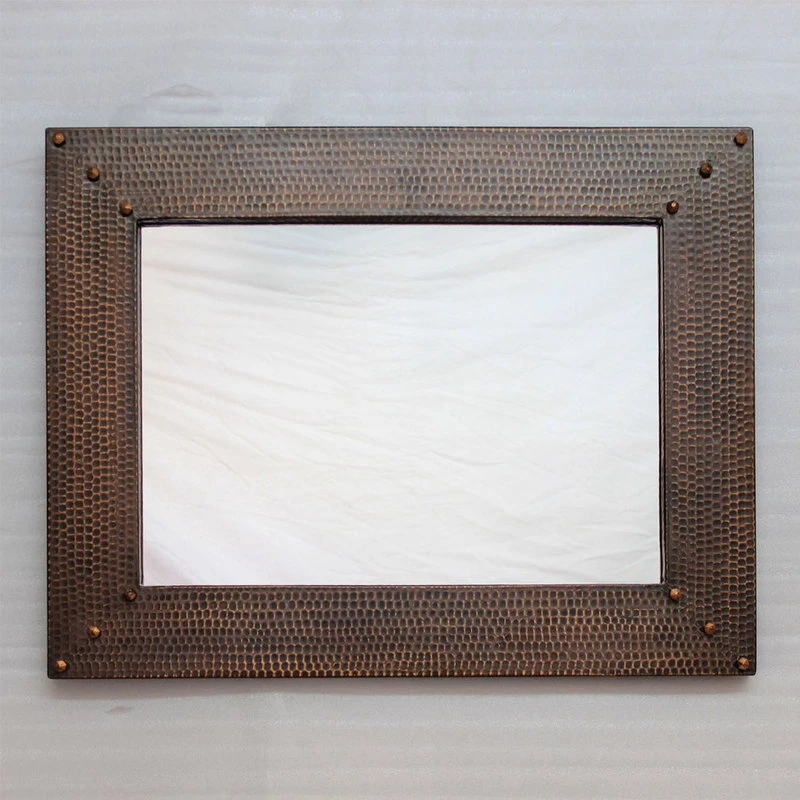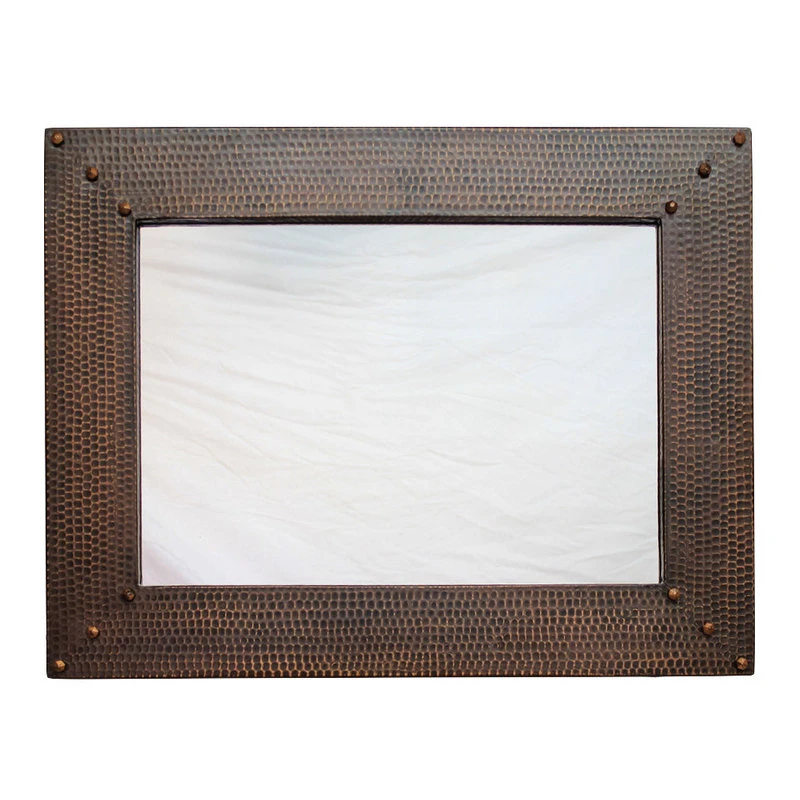 This Hammered Copper Vanity Mirror is a unique approach to an accent or vanity mirror. These copper mirrors are hand crafted and hammered by master artisans in Mexico. Available in a variety of patinas and sizes, we can also craft you a fully custom mirror to fit whatever space you may need filled. Hammered copper vanity mirror – 27″ x 21″.