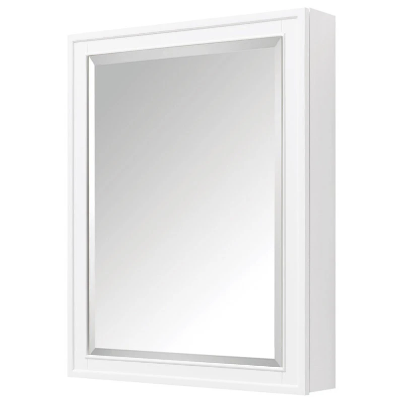 The Madison 24 in. X 5.1 in. x 32 in. Poplar framed mirror cabinet features a White finish with strong decorative lines. Three glass shelves are included for easy storage. It matches the Madison vanities for a coordinated look and includes mounting hardware that makes leveling easy.