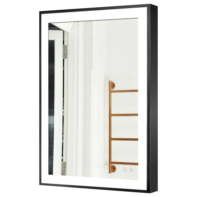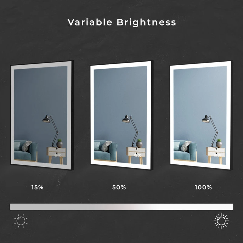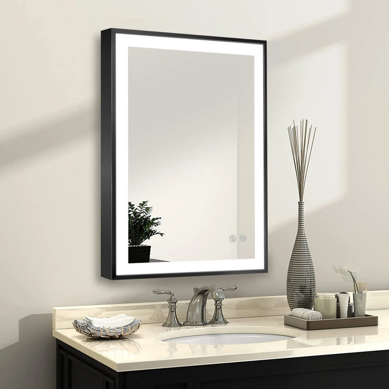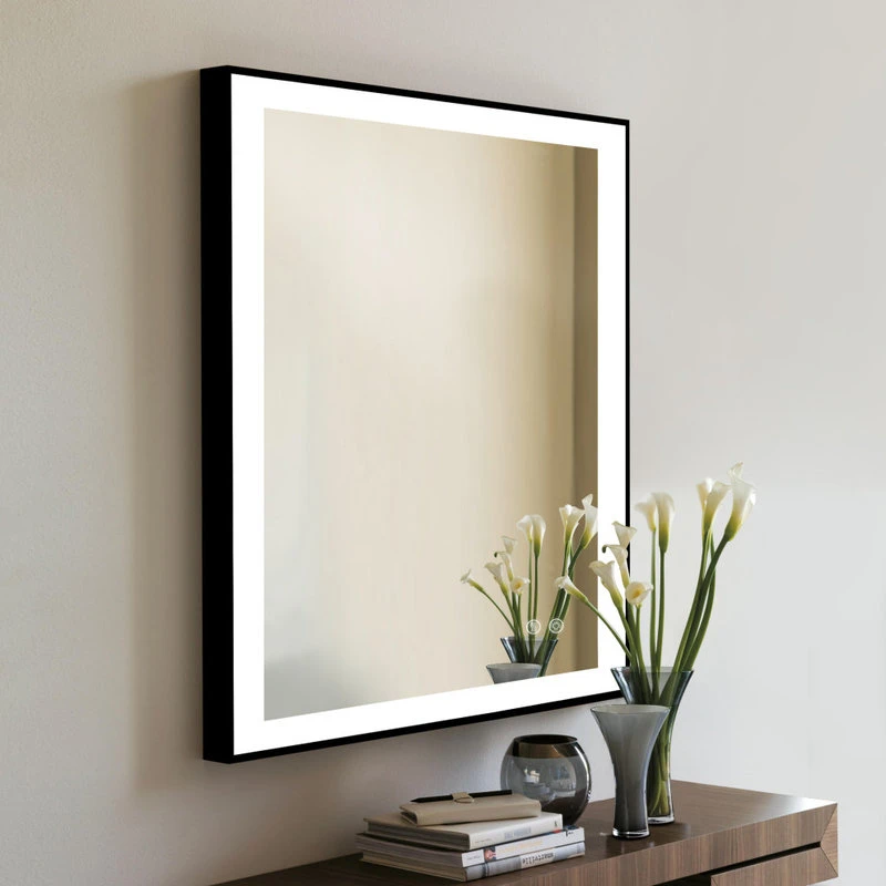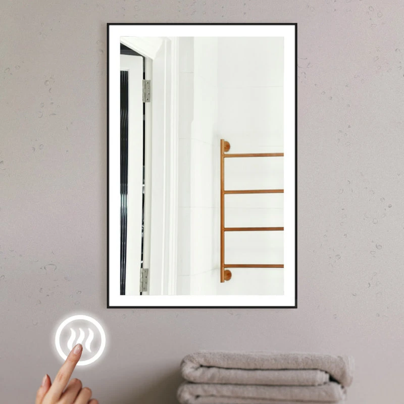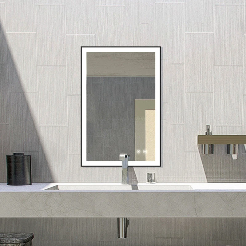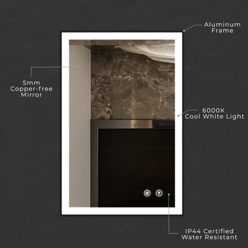 High-End Finishing: The 5mm thick copper-free environmental mirror comes in 2 appealing framing options, either Matte Black to add to the aesthetics of modern interior decor. Plus, its IP44 waterproofing rating makes it distinguishable from the rest of the LED mirrors. User-Friendly: Framed LED mirrors to meet the needs of attaining a fine makeup or shave by adjusting the brightness level, using smart touch sensors to control the entire function. It comes with UL-certified electric parts with an American standard plug. Smart Touch Sensor: A 6-key smart touch sensor makes sure to sway all the functions from On/Off to adjust the brightness level or to change the warmer light to a cooler tone.Anti-Fog Feature: Its anti-fog feature keeps the mist away, prevents the framing material from corrosion or rust.Warranty, Sizes: Comes with a 1-year warranty to provide customers with extra value. Find 3 different sizes in champagne gold or black framed LED bathroom mirror; 20”x30”, 24”x36”, 40”x30”.High-End LED Lights: High-lumen LED lights are used to provide a clear view, High-density LED strips with 240 beads give equal light distribution for full coverage.Easy Installation: It’s way handy to DIY install black-framed LED mirrors at home in less than 10-15 minutes. You can either mount it on the vertically or horizontally. Adjustable Brightness level: Tune the brightness level to avoid cakey makeup, by keeping pressing the button.