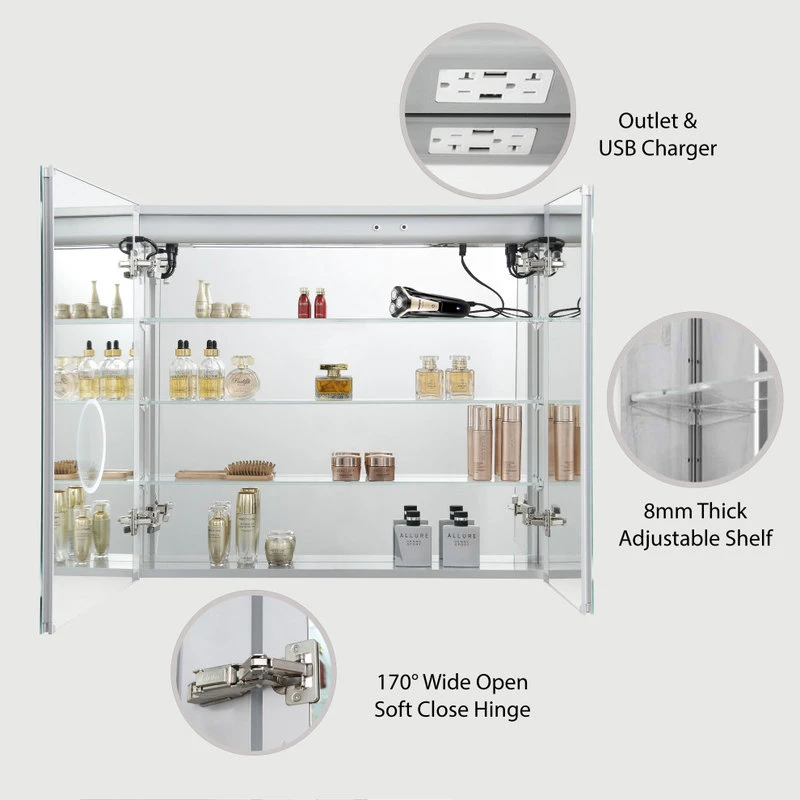 - Built-in 20Amp dual outlet and USB 2.0 port for phone or shavers charging inside this bathroom mirror medicine cabinet.