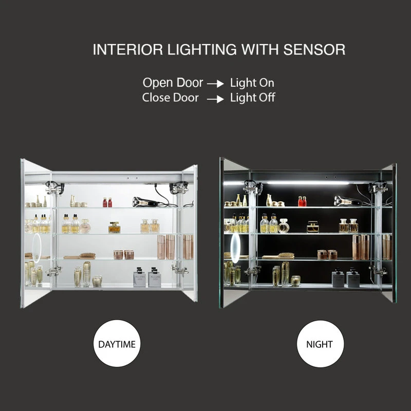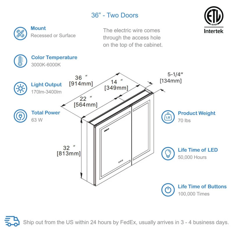 - THREE SOFT TOUCH SWITCH makes this ETL Certified LED Medicine Cabinet simple and easy to turn ON/OFF, adjust brightness and change color temperature.
