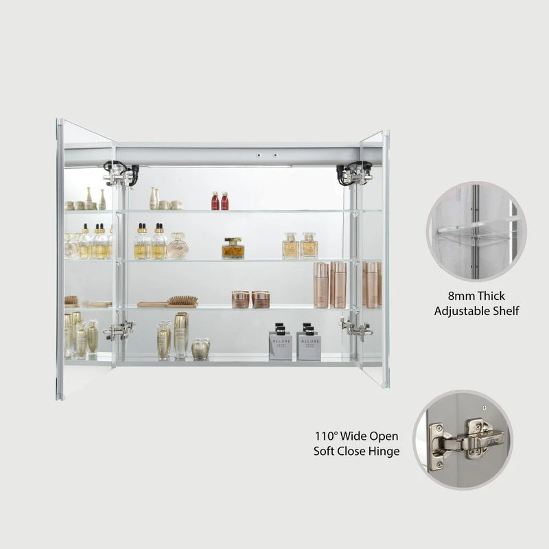 - BUILT-IN DEFOGGER means fogless makeup time is just one touch away. All these features make it the perfect led mirror medicine cabinet.