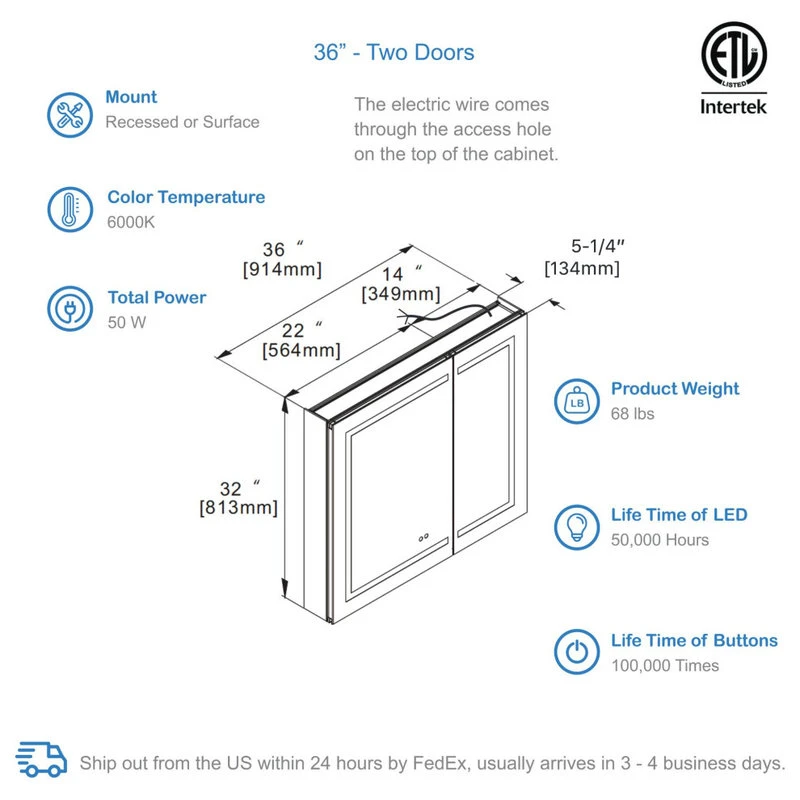 - TWO SOFT TOUCH SWITCH makes this ETL Certified LED Medicine Cabinet simple and easy to turn ON/OFF and adjust defogger.