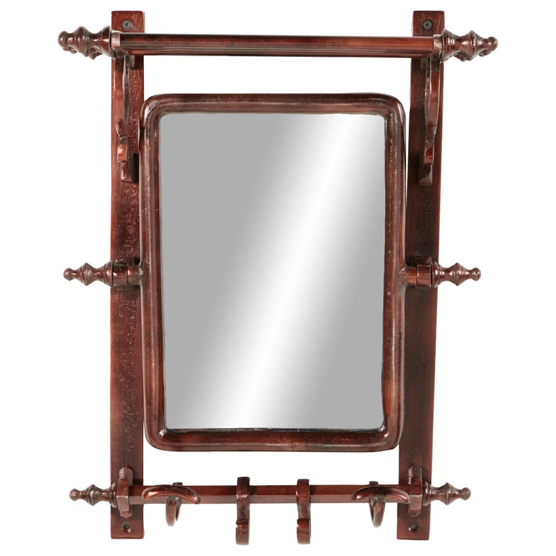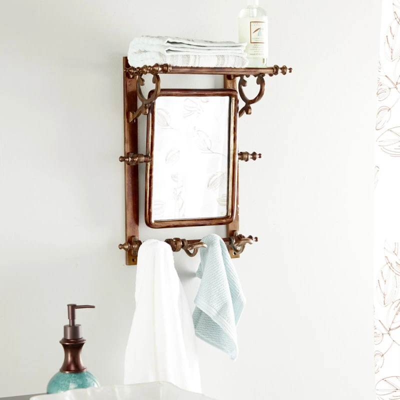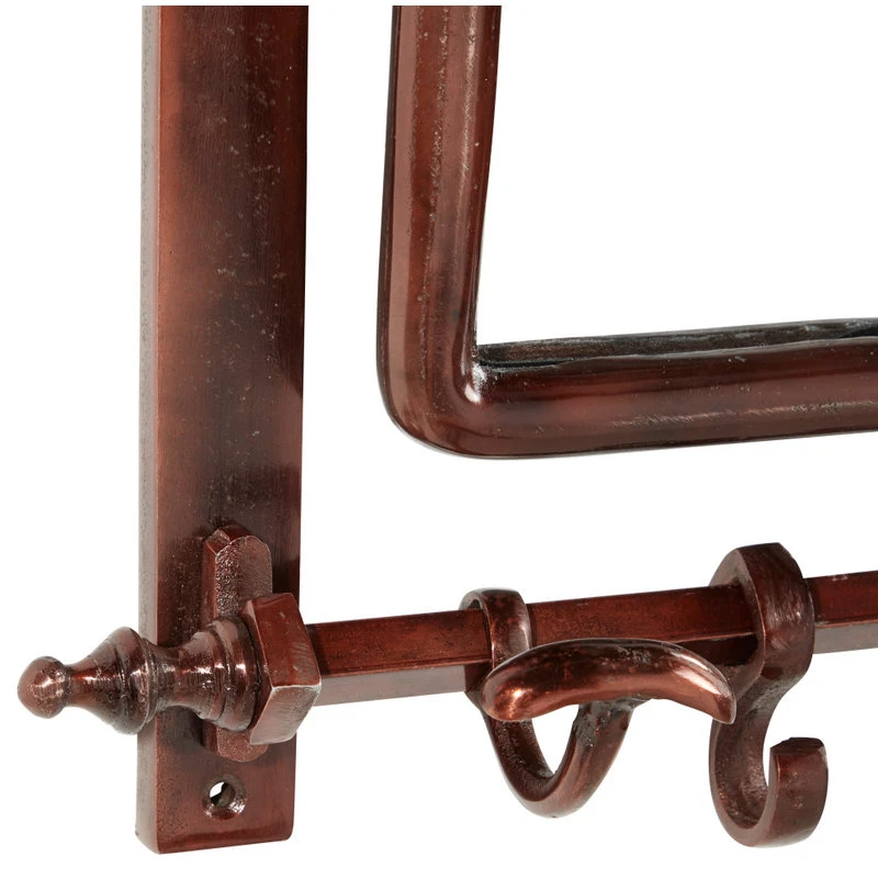 Complete your antique-styled space all the way through to your bathroom with this stunning copper wall rack with wall hooks, featuring a rectangular mirror. The top rack has three metal bars that arch upward to cradle your linens and towels, preventing them from falling. Beneath that metal rack is an elegant rectangular-shaped copper mirror followed by four copper wall hooks, perfect for drying towels or hanging hand towels. The antique copper finish coupled with the stately finials and decorative arch work adds a very vintage and opulent touch to your space.