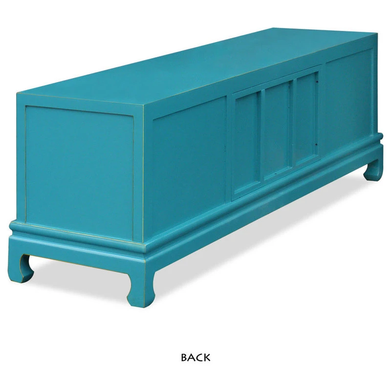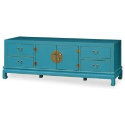 Sleek in shape and spare in decoration, this distressed blue elmwood Kang media cabinet exemplifies the Ming philosophy of beauty in simplicity. The cabinet features one central double door compartment and four drawers. The compartment comes with one removable shelf. Hand-forged circular brass plate, hinges, and pull hardware complete the overall look. With a low profile and ample storage space, this cabinet is the perfect media cabinet for any home. The overall cheerful blue finish will also add a touch of positive Asian flair to any room.