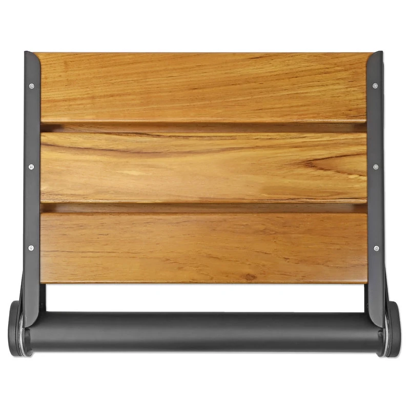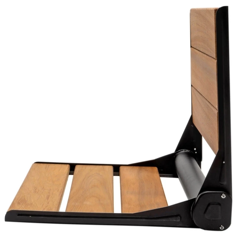 The Home Aesthetics18″ Teak Wood Seat is a one person folding shower bench. Featuring a high strength easy close mechanism that allows the bench to fold up and stay up! Back rest is easily removable for easy cleaning of the tiles behind the backrest. Automatically fold up to store out of the way. No need to lock into place, a machined precision tension hinge prevents the seat from inadvertently falling down. Slim 3” folded profile