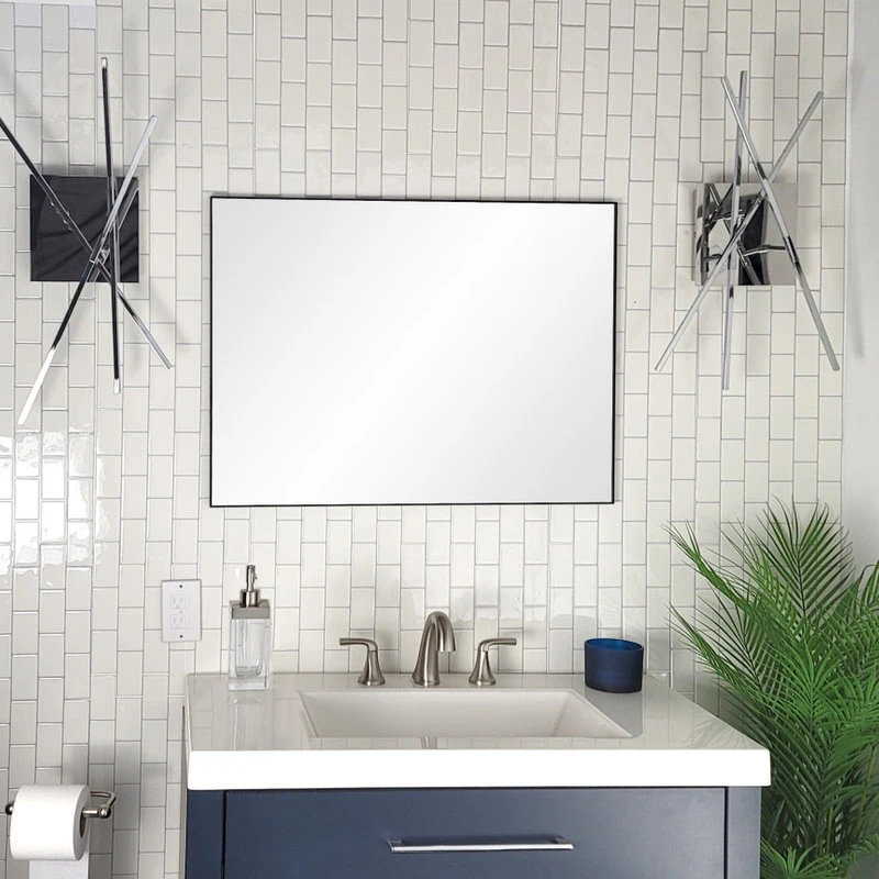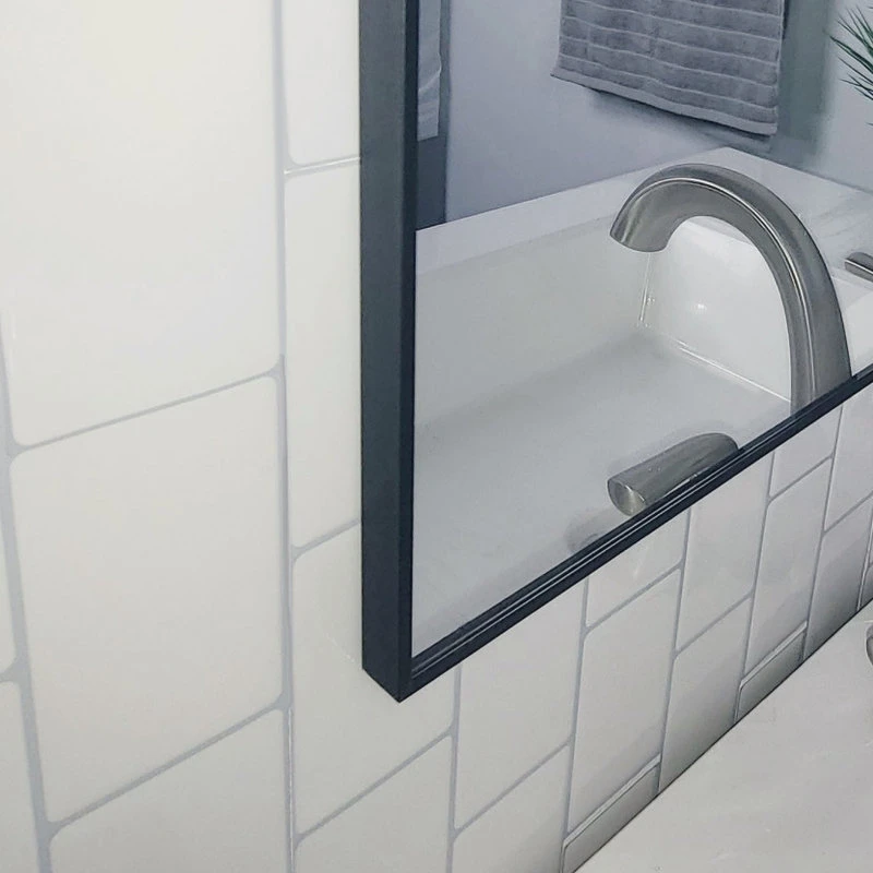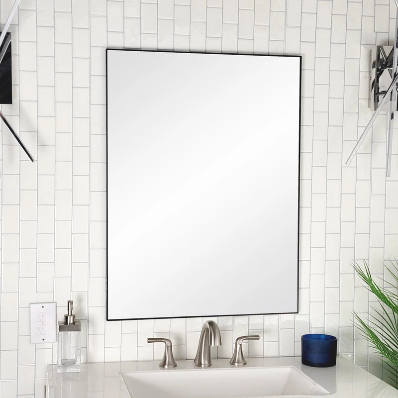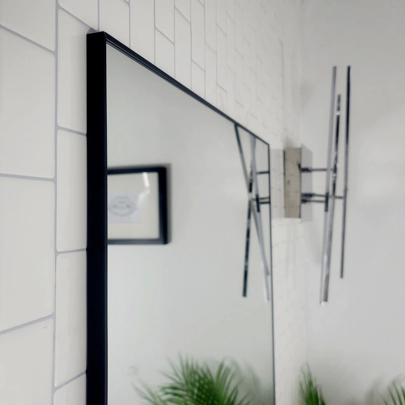 The Vanta modern metal framed mirror is part of Decor Wonderland’s En Passant Framed Collection. This gorgeous classic mirror features an ultra thin solid metal frame profile to allow your room decor to stand out, add brightness without an overpowering heavy frame. The mirror is made with premium 5mm float glass and silver. When used in a bathroom this versatile mirror suits chrome, brushed nickel or matte black fixtures. There are 3 brackets affixed to the back to hang either horizontally or vertically just chose which 2 brackets to use. Alone or in multiples, this decorative wall mirror is an easy update for any room renovation. Features:
