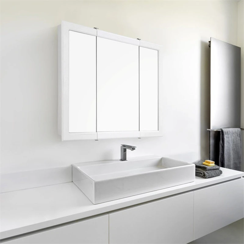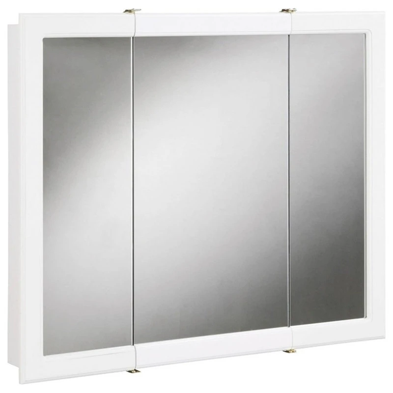 The Design House 531434-WHT Concord Tri-View Wood Medicine Cabinet features a durable white gloss finish, dual shelf design, and concealed hinges. The cabinet doors glide open, revealing (2) stationary shelves to hold shampoo, medicine, makeup, and other toiletries. Use this mirror for shaving or applying makeup in the morning. The product comes assembled and ready for installation.