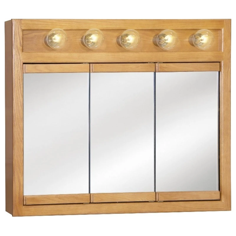 The Design House 530618-NOK Richland Lighted Tri-View Medicine Cabinet Mirror features a water-resistant nutmeg oak finish, a solid wood frame, a 3-door design, and (5) vanity lights to brighten your entire space. Uses (5) 60-watt medium-base bulbs or LED equivalent (not included). The cabinet doors glide open, revealing (2) stationary shelves to hold shampoo, medicine, makeup, and other toiletries. This cabinet is built to withstand the moisture and humidity from your shower and will not chip or stain. Use this mirror for shaving or applying makeup in the morning. The product comes assembled and ready for installation.