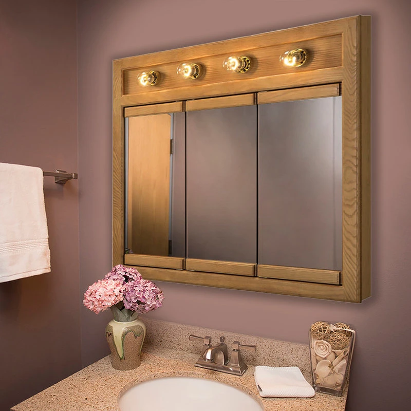 The Design House 530626 Richland Nutmeg Oak 6-Light Tri-View Wall Cabinet features a nutmeg oak finish with a water resistant seal. This product has a rustic shabby chic design, meshing modern construction with vintage aesthetics. With a solid wood door frames and 3-door design, this medicine cabinet measures 48-inches long by 30-inches wide and features six vanity lights to brighten up your entire bathroom. With a country living motif, this medicine cabinet graces your home with its bright finish and clean lines. This product is perfect for remodeling your bathroom and matches painted cabinets and granite countertops. The cabinet doors glide open revealing shelves to store shampoo, medicine and makeup. The cabinet doors open with a fluid motion, do not whine or creak and can endure moderate stress. This mirror will not chip or stain in steamy bathrooms and damp moisture. Use this mirror for shaving or applying makeup in the morning. The preassembled cabinet is CARB compliant and is UL listed and approved for damp areas. With a strong corrosion resistant finish, this product attests to the quality of all Design House products, and integrates traditional curves with the amenities of industry leading features.