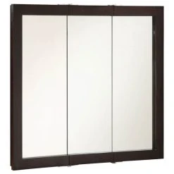 The Design House 541359-ESP Ventura Espresso Tri-View Medicine Cabinet Mirror features an elegant espresso finish, (3) doors, a solid wood frame, and (2) stationary shelves. It measures 36inch W by 6inch D by 30inch H. The cabinet doors glide open, revealing (2) sturdy shelves to hold shampoo, medicine, makeup, and other toiletries. This cabinet is built to withstand the moisture and humidity from your shower and will not chip or stain, and the mirror is perfect for shaving or applying makeup in the morning. The product comes assembled and ready for installation.