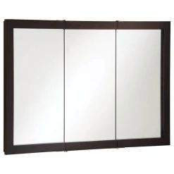 The Design House 541367-ESP Ventura Espresso Tri-View Medicine Cabinet Mirror features an elegant espresso finish, (3) doors, a solid wood frame, and (2) stationary shelves. It measures 48inch W by 6inch D x 30inch H and contains (2) sturdy shelves to hold shampoo, medicine, makeup, and other toiletries. This cabinet is built to withstand the moisture and humidity from your shower and will not chip or stain. Use this mirror for shaving or applying makeup in the morning. The product comes assembled and ready for installation.