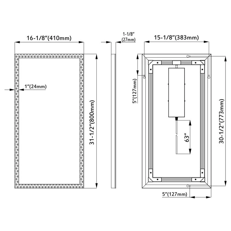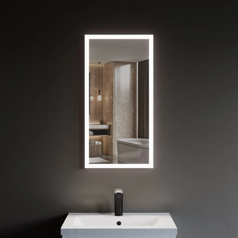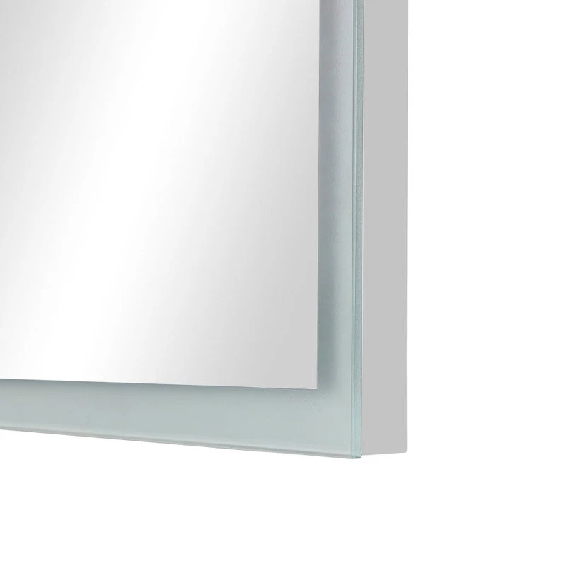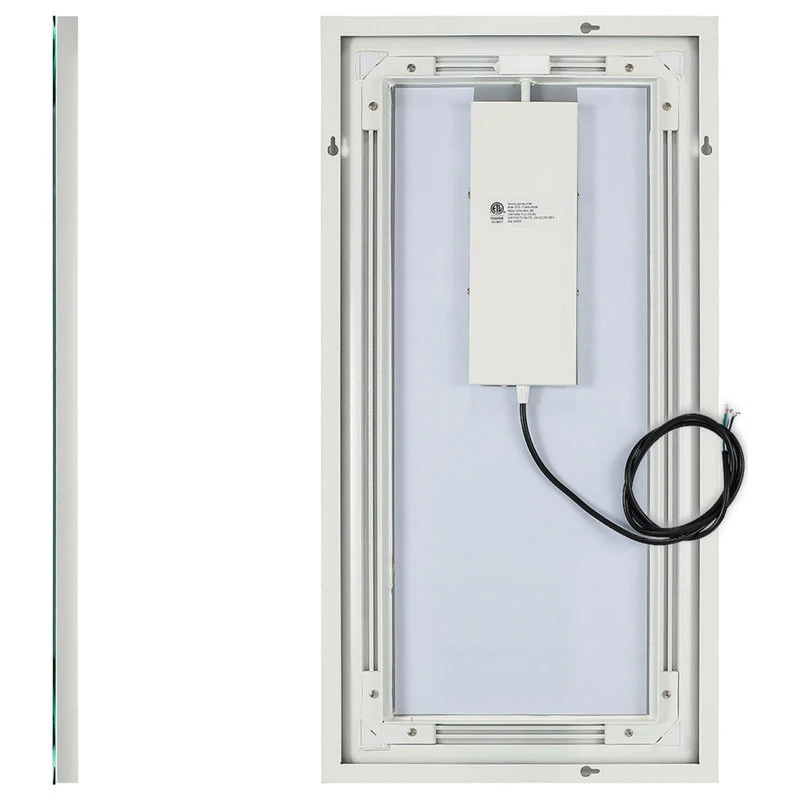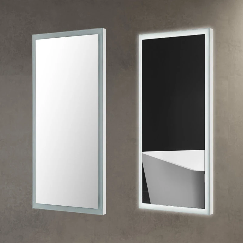 Wall-mounted rectangular LED mirror that lights via external light switch (not included) connected to electrical power source. Available in white in widths of 16″, 24″, 30″ 36″ and 48″ Mirror face is framed by 1″ wide glass through which light shines