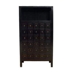 This cabinet with 30 drawers was used to hold herb medicines in a Chinese apothecary centuries ago. The name of each herb medicine is written on the door. It shows a nice patina in dark chocolate color. This exotic apothecary cabinet will not just be an excellent showpiece, but can be used as a CD cabinet or to store tools, office, or art supplies.