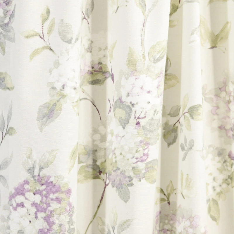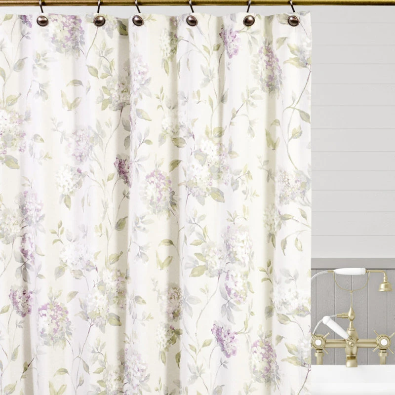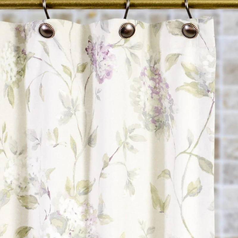 Bring the gorgeous sights of Spring indoors. Our traditional hydrangea pattern on high quality fabric will drape beautifully and bring a breath of fresh air into the entire room. Abigail is a multi colored traditional Hydrangea floral print pattern on solid natural colored ground that features a range of shades and colors that coordinate easily with a variety of solids and patterns within your home. Made with 52-percent polyester/48-percent 5-ounce cotton fabric creates a smooth draping effect, soft texture and easy maintenance. The Shower Curtain measures 72-inches wide and is 72-inches long from top to bottom of panel. One shower curtain will fit a standard size shower and will require 12 shower curtain rings to hang. Matching Abigail Valances, Panels and Tiers also available . Machine washable.