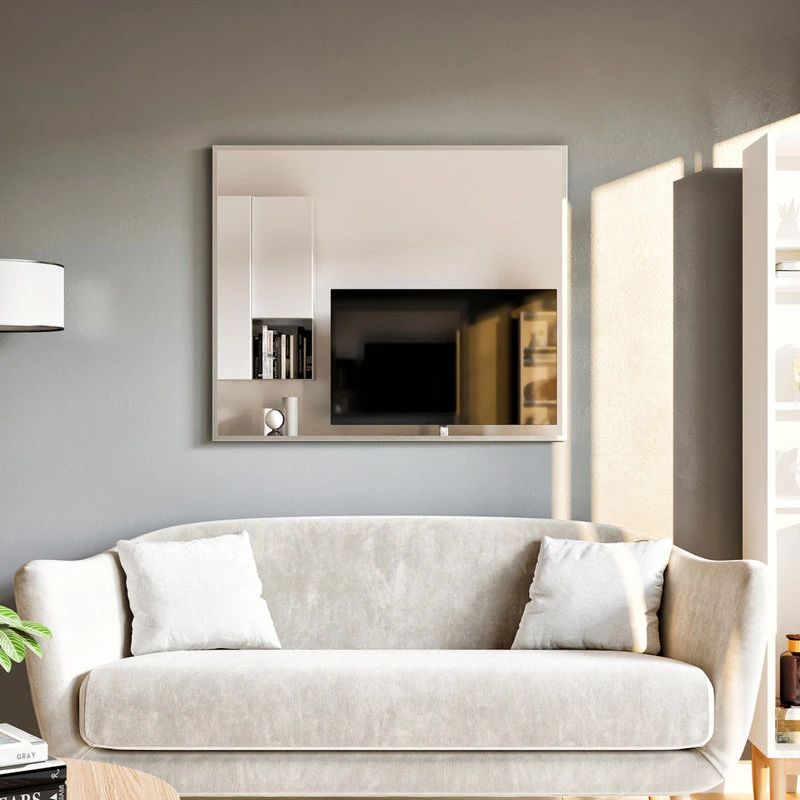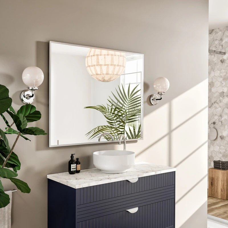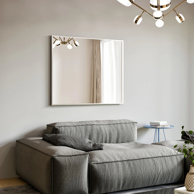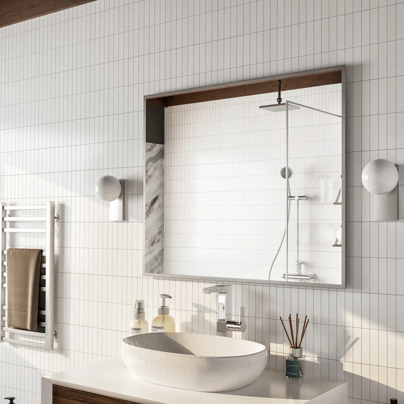 Measuring 35 by 30 inches, the Eviva Sax Framed Bathroom Wall Mirror features a simple chrome frame. This versatile piece is designed to match many bathroom styles. Place this mirror over your vanity or on a side wall. This mirror will add an enlarged sense of space and light to your bathroom.