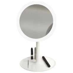 Easily perform your morning routine with this LED Table Mirror with Accessory Tray. This small yet chic matte white mirror has been designed to provide convenience to your everyday life while also matching virtually any style of bathroom or bedroom decor. The LED frame provides light with just a touch of the base to provide a soft natural-like light to assist you, and the tilting head allows you to adjust the mirror to your desired angle. The attached bottom tray provides stability and also provides the perfect place to keep your brushes, makeup, or other small accessories. Its lightweight form allows you to easily move the mirror from room to room or closer to another light source such as a window or lamp. Perfect for applying or removing makeup, shaving, exfoliating, or other common routines.