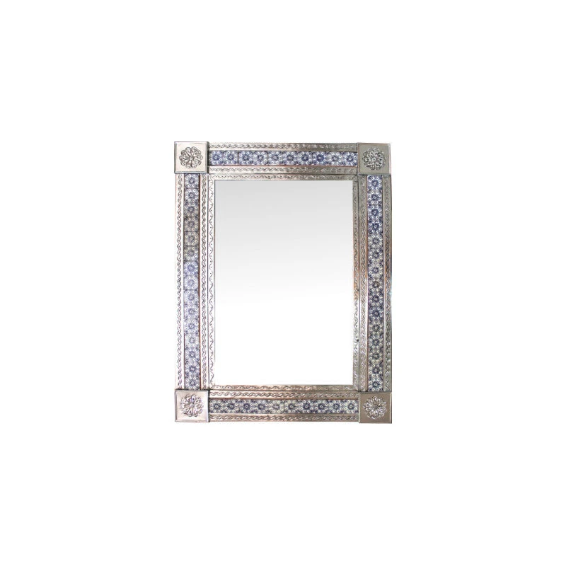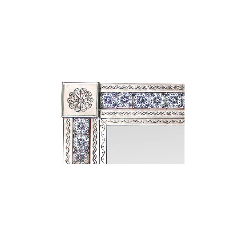 This is a big tin mirror, fully decorated all the way around its frame. These decorations are known as punched tin. In the frame central part has hand-painted Blue Bouquet Talavera Tile which has a white background along with navy blue in the foreground decorations.This mirror will delight your home decor. It will fit any dressing area such as your bathroom or a hallway. On each corner it has a square with a flower in the center, all of it in a single piece of tin. A piece of art that you will be delighted with, and proud to hang it on your walls.This mirror can be hung either vertical or horizontally.IMPORTANT: Because of the high rate of shattered glass in shipping this big mirror, we decided NOT to ship the glass anymore. In other words: You are purchasing just the frame.