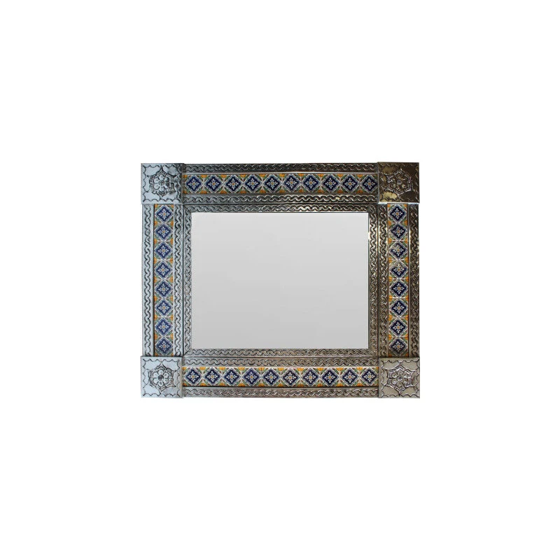 This is a medium tin mirror, fully decorated all the way around its frame. These decorations are known as punched tin. In the frame central part has hand-painted Guadalajara Talavera Mexican Tile. This mirror will delight your home decor. It will fit any dressing area such as your bathroom or a hallway.The dimensions described in the Main characteristics” section are overall dimensions. The frame is about 5″ wide which makes the glass about 16″ x 20″”