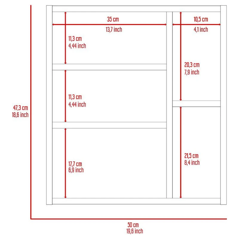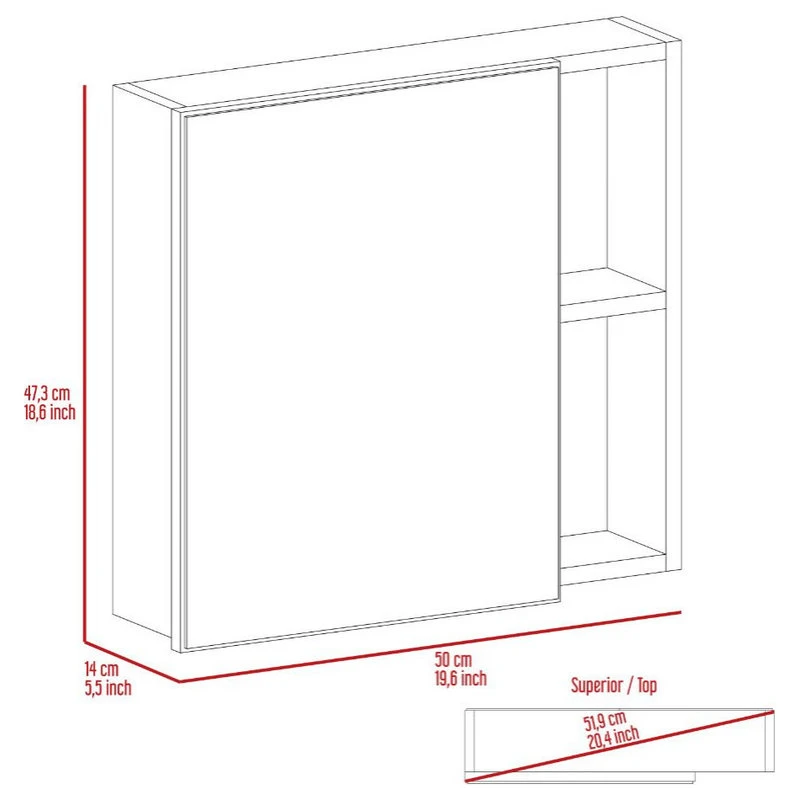 - Includes a ample mirror in the One-door Cabinet (13,7”Wx18”H), two external shelves (4,1”Wx7,9”hx8,4”H) and countertop size (20,4”)
