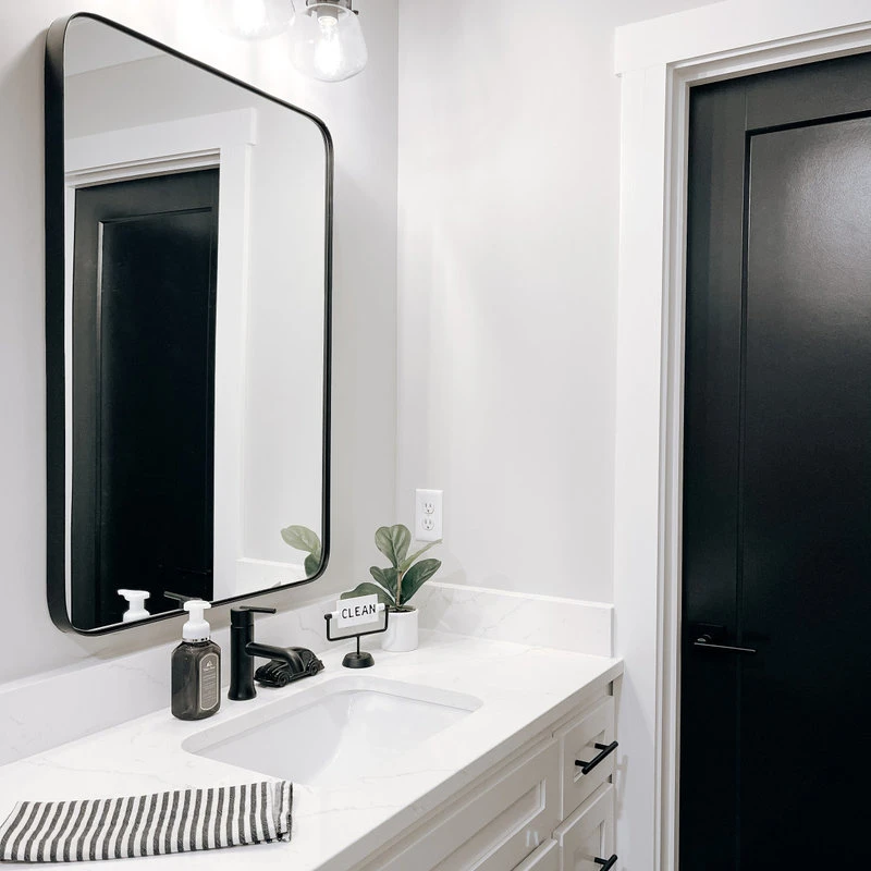 Sleek, modern, beautiful. This gorgeous mirror is sure to dazzle with its high-quality design and ease of installation. 24_W x 36_H x 1.5_D. Hangs vertical or horizontal. Hanging hardware (d-rings) installed for quick installation. Screws/anchors included. Felt backer applied to prevent unwanted marks on wall. 1.5_ frame depth with a high-quality, matte black finish. Approved for high-moisture areas such as bathrooms. Rust proof MDF frame.