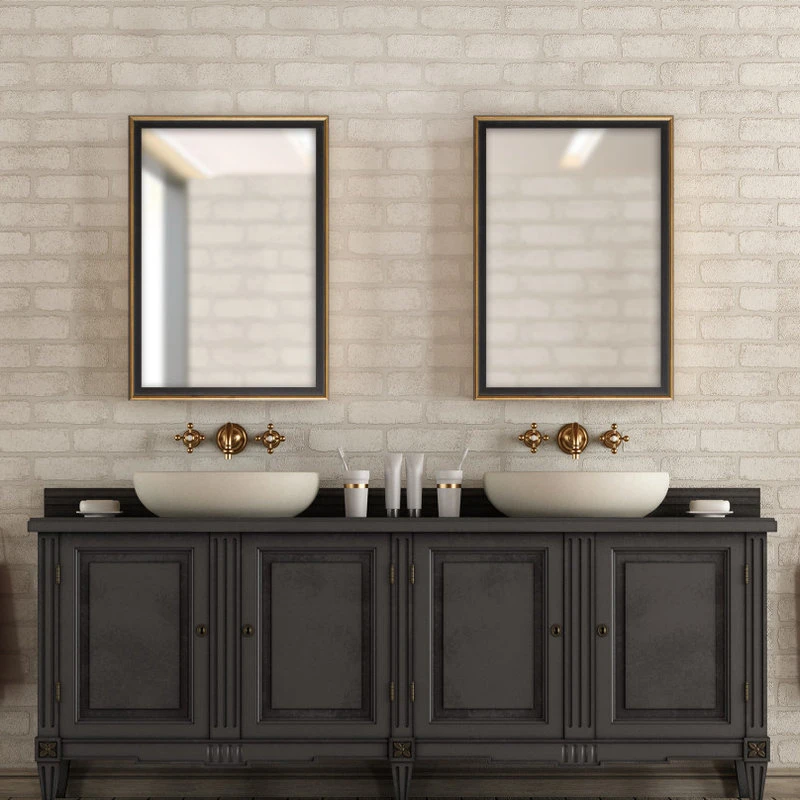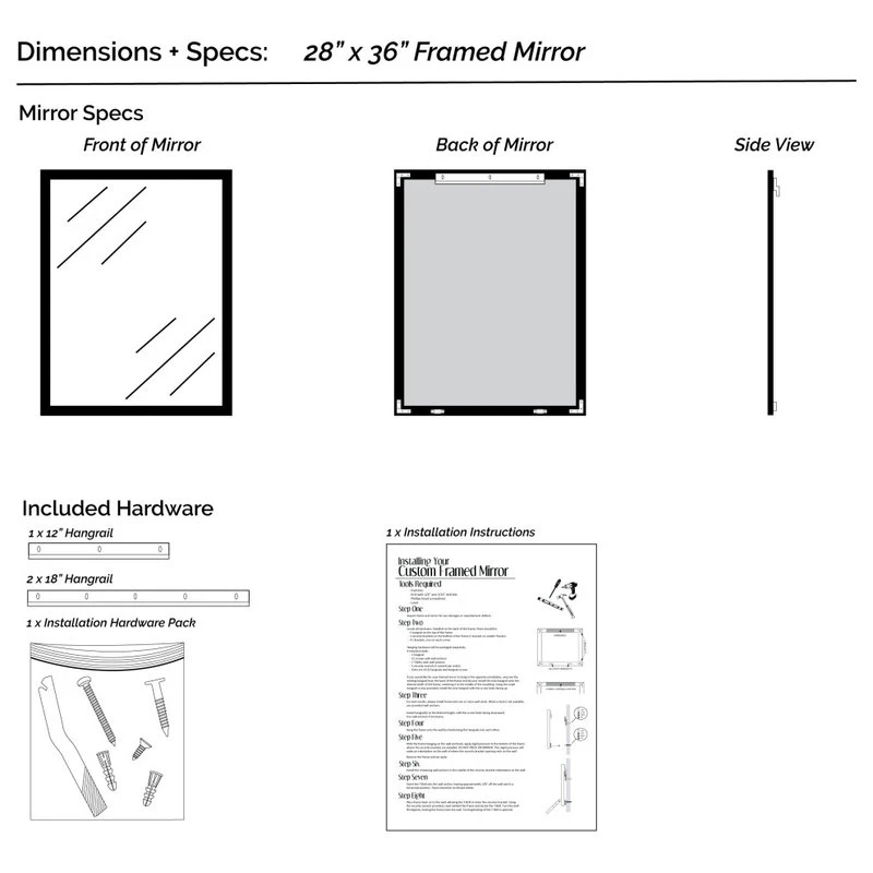 Hangrail for installation will be applied on the width of the frame. All assembly hardware and instructions will be included. Additional hangrails are included if the opposite orientation is desired for installation. The dimensions displayed are the final outside dimensions of the frame, including the mirror. CATII safety backing applied on all mirrors. Approved for high-moisture areas such as bathrooms.