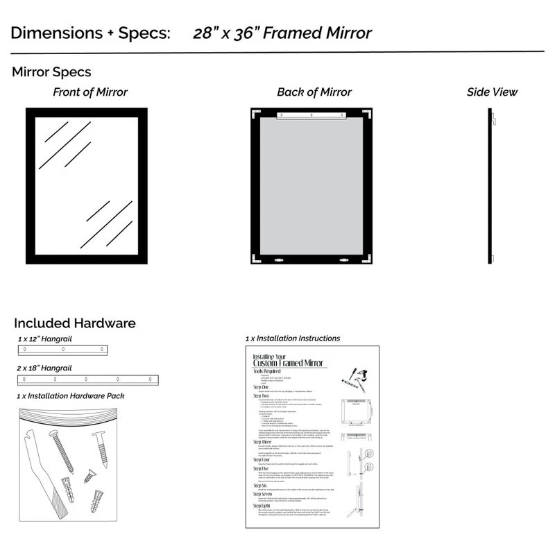 Hangrail for installation will be applied on the width of the frame. All assembly hardware and instructions will be included. Additional hangrails are included if the opposite orientation is desired for installation. The dimensions displayed are the final outside dimensions of the frame, including the mirror. CATII safety backing applied on all mirrors. Approved for high-moisture areas such as bathrooms.