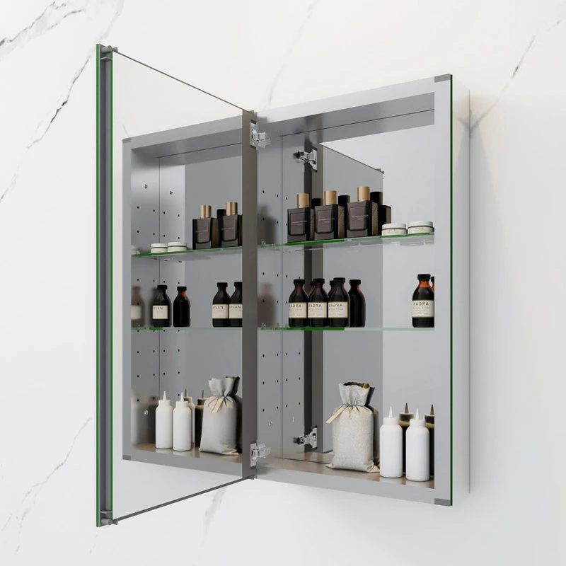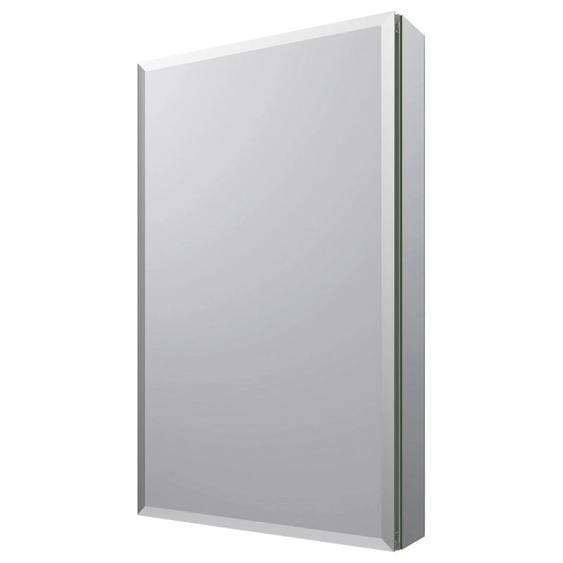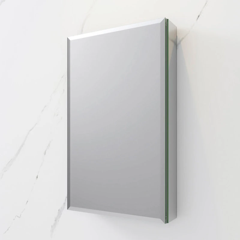 This stylish rectangular bathroom medicine cabinet has a contemporary frameless design with a beveled edge. The mirrored door opens to reveal a second mirror at the back of the cabinet and two adjustable glass shelves that can accommodate items of varying heights. An anodized aluminum frame creates a moisture and dust resistant interior.