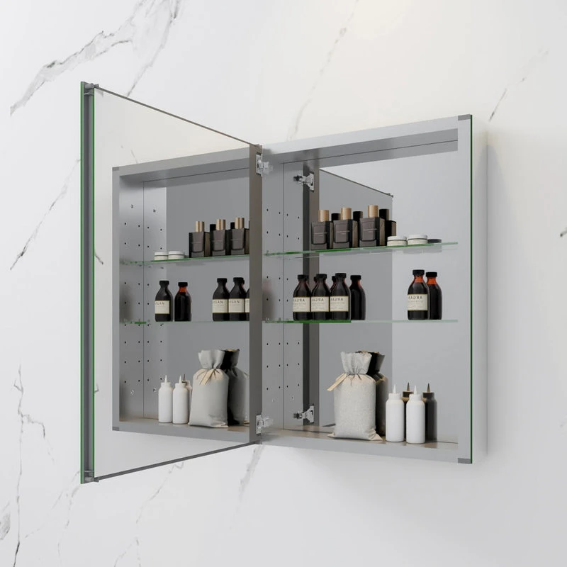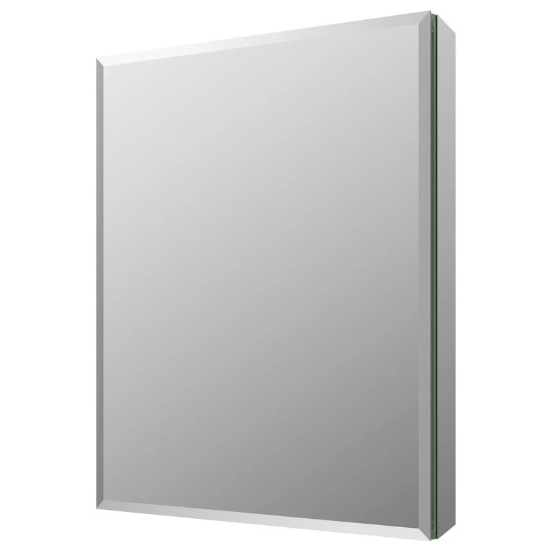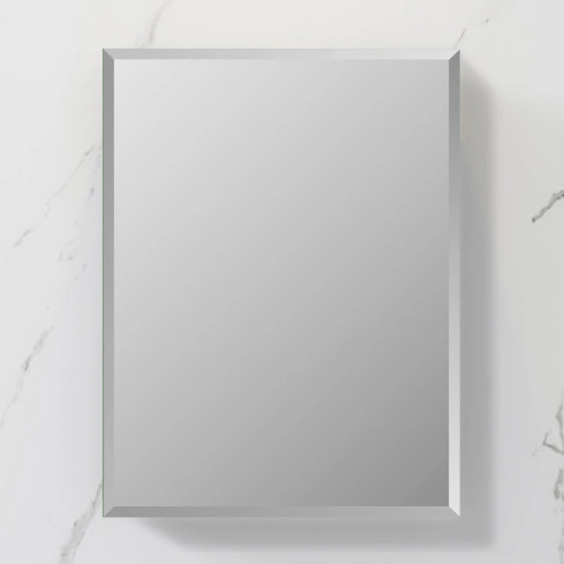 This stylish rectangular bathroom medicine cabinet has a contemporary frameless design with a beveled edge. The mirrored door opens to reveal a second mirror at the back of the cabinet and two adjustable glass shelves that can accommodate items of varying heights. An anodized aluminum frame creates a moisture and dust resistant interior.