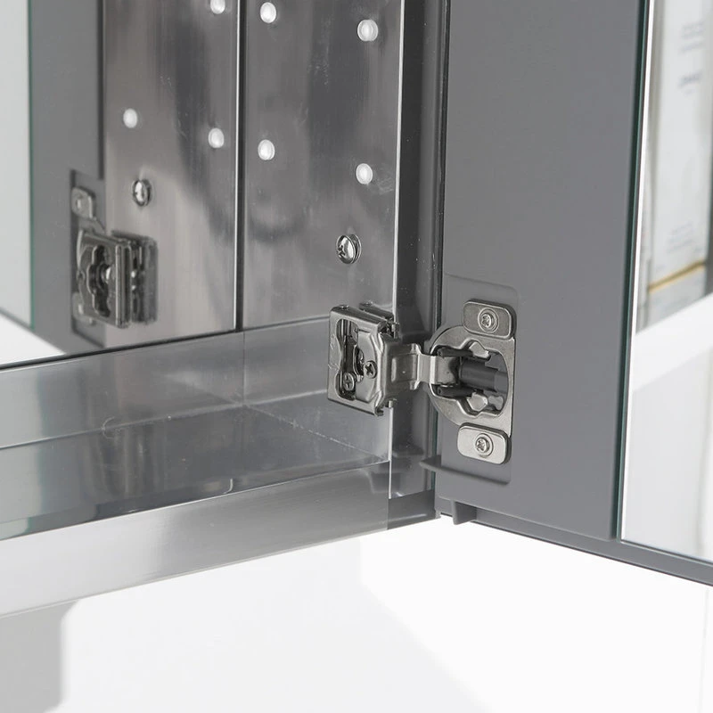 This 50″ medicine cabinet features mirrors everywhere. The edges have mirrors and also on the interior of the medicine cabinet. The inside features four tempered glass shelves. Can be wall mounted or recessed into the wall.
