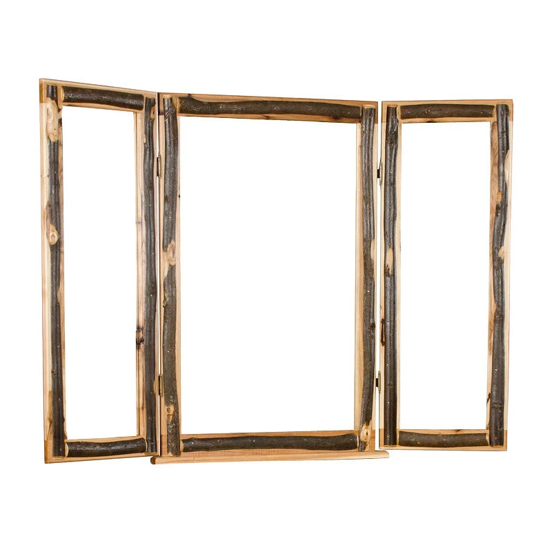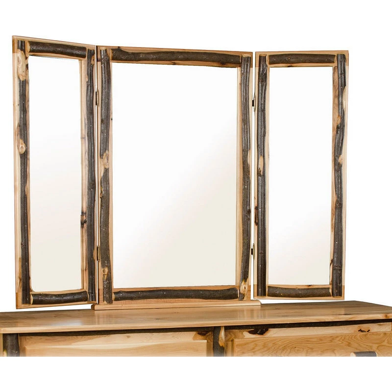 Bring the beauty of rustic furniture indoors with this lovely custom-made tri-view mirror with hickory log accents on each piece. Each piece is one-of-a-kind, using traditional joinery methods to build a natural piece that will last for ages. It makes the perfect addition to any of our Hickory dressers or let your imagination take hold.