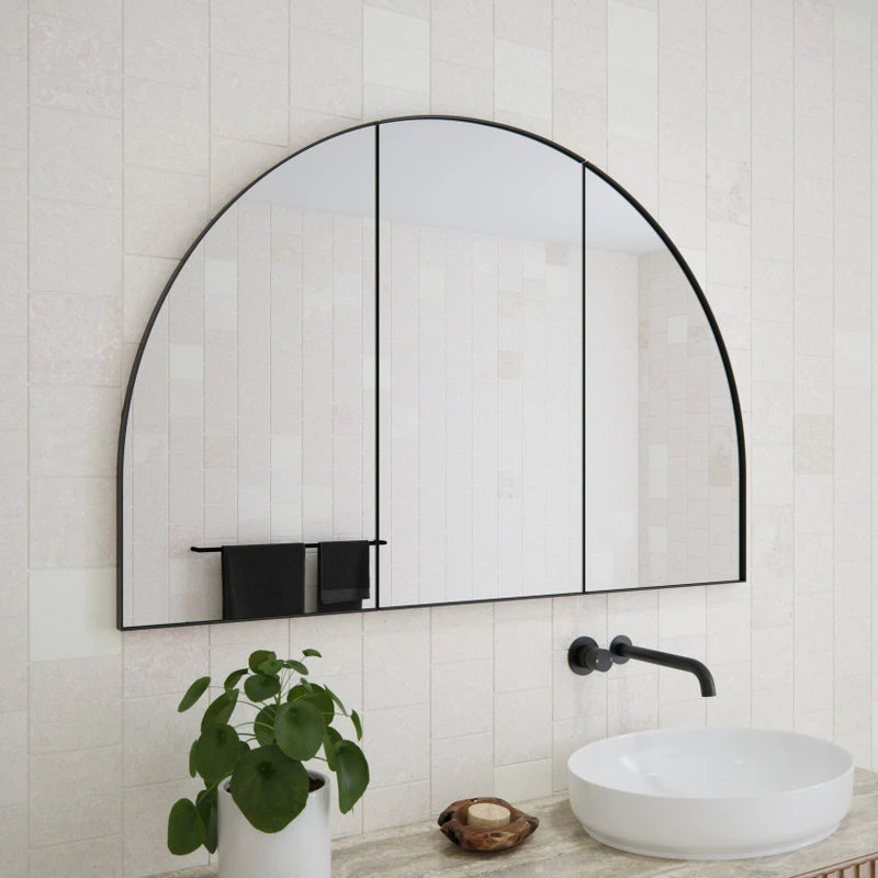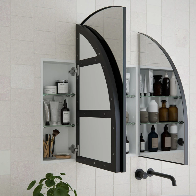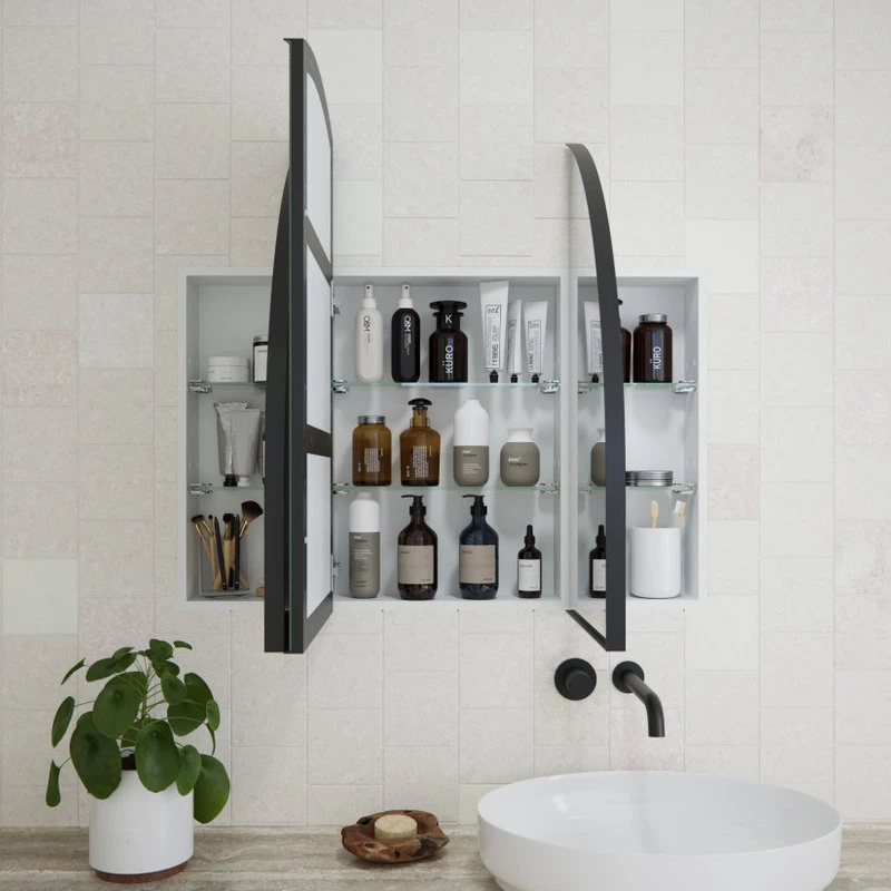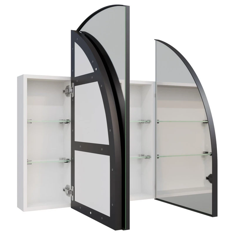 A gentle, fluid curve defines the Aria 3-door mirror medicine cabinet, creating an element of refined sophistication that will transform your bathroom. Featuring an attractive arched powder-coated rust-resistant steel frame and tri-view mirrored doors, the Aria is designed to be recessed or mounted on the wall. This gorgeous vanity mirror cabinet by Glass Warehouse also features six glass shelves, offering plenty of storage to keep your products hidden out of sight. As a result, your bathroom will look and feel like the ultimate sanctuary.