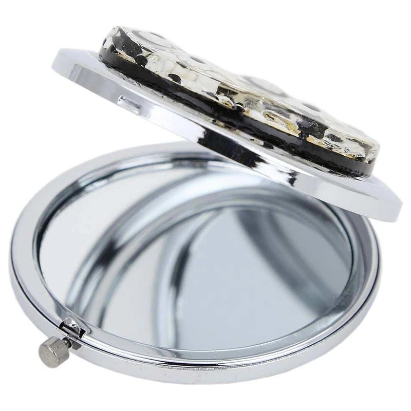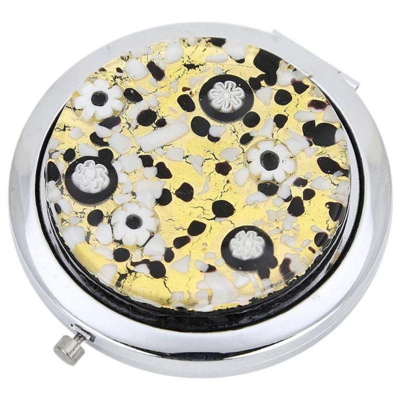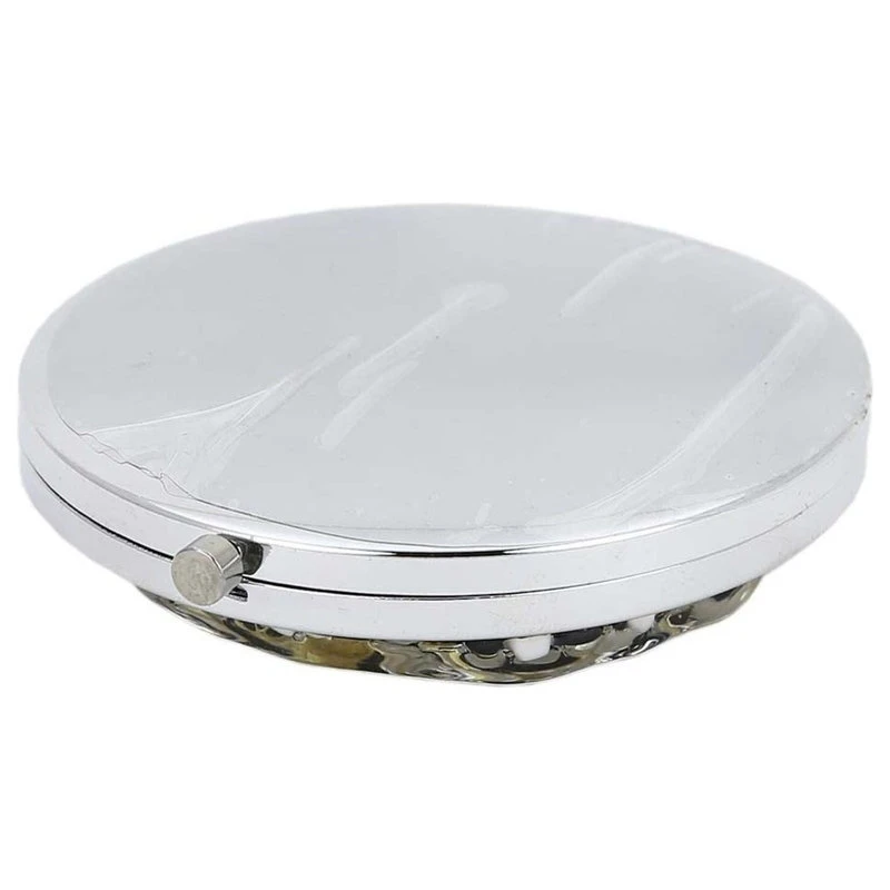 The folding mirror features authentic Murano Glass top and shiny durable silver-plated finish. It opens up to reveal two high-quality round mirrors. The mirror is easy to open with a click of a button and it closes easily and securely. There is no glass on the bottom.