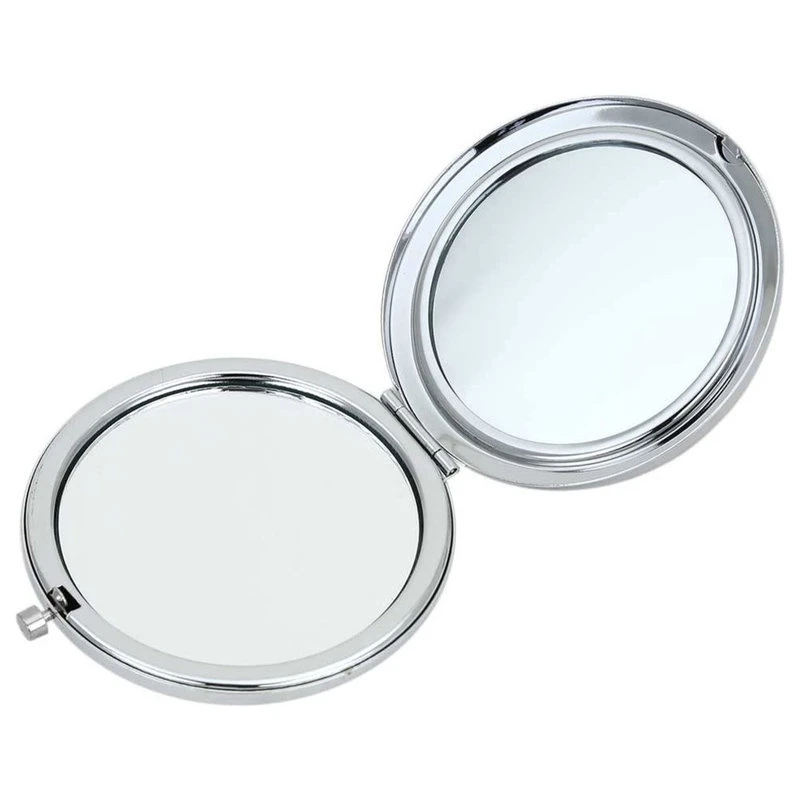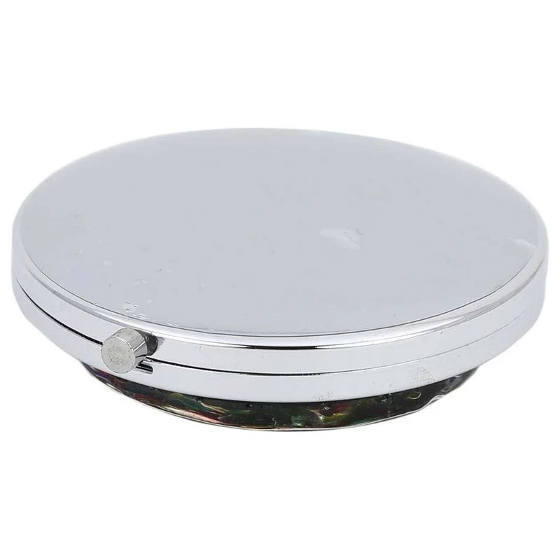 The compact folding mirror features authentic Murano Glass top and shiny durable silver-plated finish. It opens up to reveal two high-quality round mirrors. The mirror is easy to open with a click of a button and it closes easily and securely. There is no glass on the bottom.
