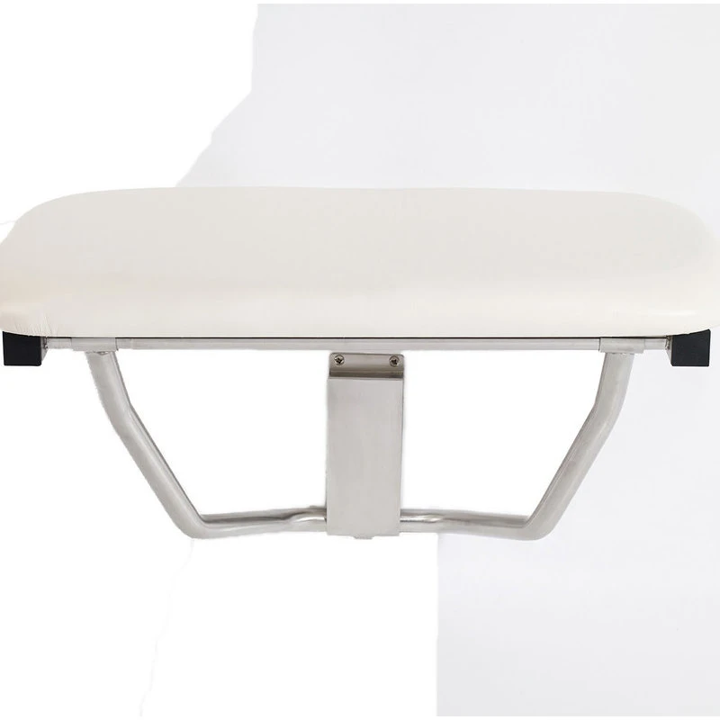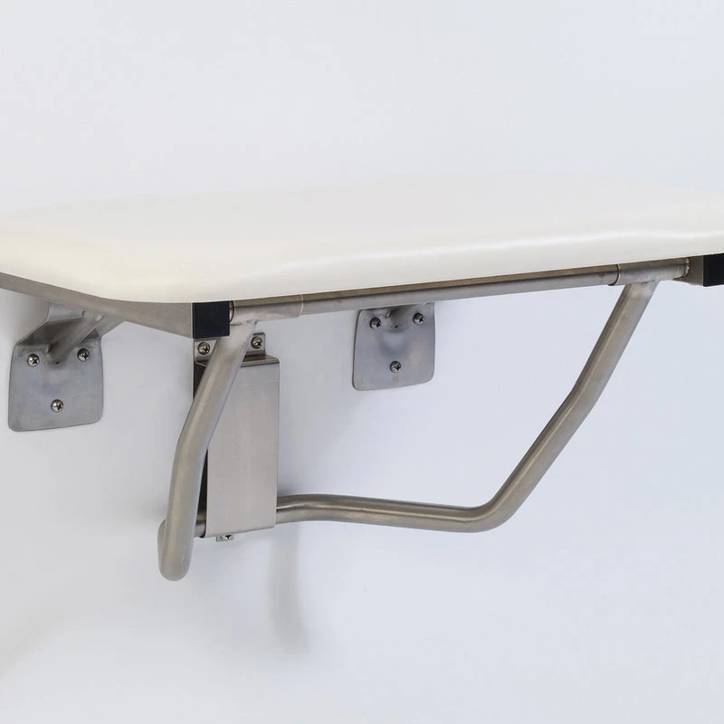 - Seat Frame: 1 Inch (31.75mm) square 16 gauge and 1″ (25mm) diameter round 18 gauge stainless steel satin finished tubing with #4 satin finish. The mounting brackets are manufactured from 12 gauge stainless steel. The (optional) easy to fold legs have adjustable feet, allowing you to adjust to the pitch of the shower pan or floor, from 17 to 19 Inches (431.8mm to 228.6mm) to the floor.