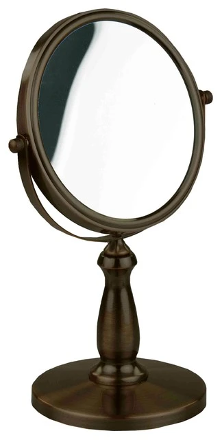 - Get a close up view with this counter top cosmetic mirror. Made from heavy duty bronze plated steel. High polish mirror for a crystal clear view. 1x magnification on one side and 2x on the other. Looks great in any bathroom setting.