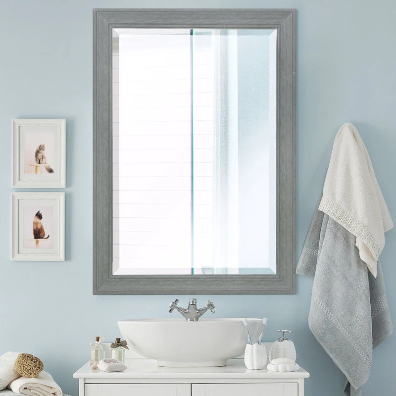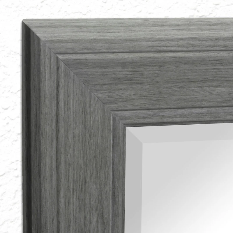 This minimalist gray woodgrain-textured beveled mirror is the perfect finishing touch to any space. Instantly brighten up any room, hall, or corridor with this expertly crafted mirror and give yourself, your family, and your guests a place to admire their reflection.