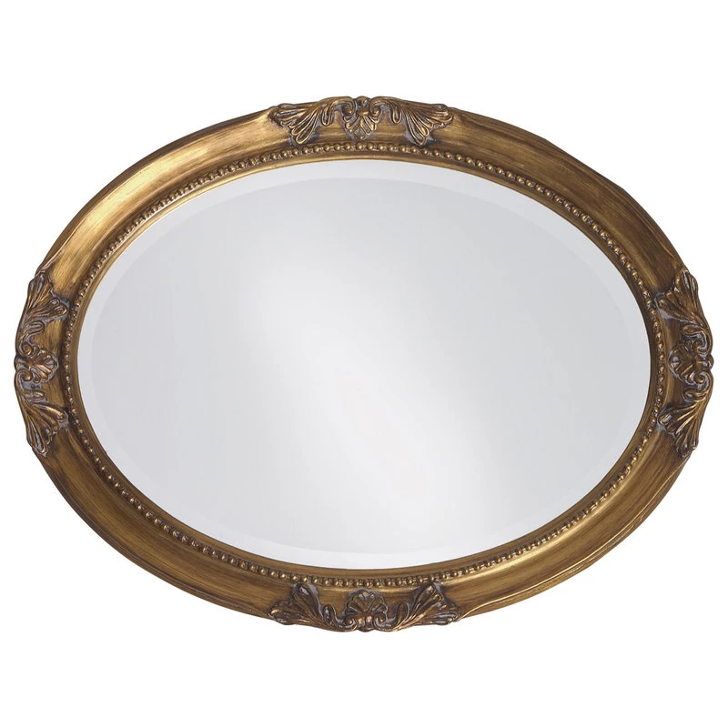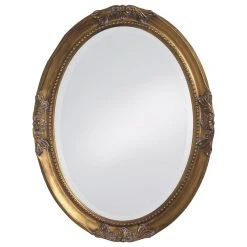 This features an antique gold finish. The oval frame is made from wood and is accented with a beaded textured inset and decorative adornments on each side of the frame. For more added detail the mirror features a one inch bevel. Its style makes this mirror a favorite for bringing some flair to your decor. This simple yet stunning piece would be a great addition to any room. It is a perfect focal point for an entryway, bathroom, bedroom or any room in your home. D-rings are affixed to the back of the mirror so it is ready to hang right out of the box in either a horizontal or vertical orientation!