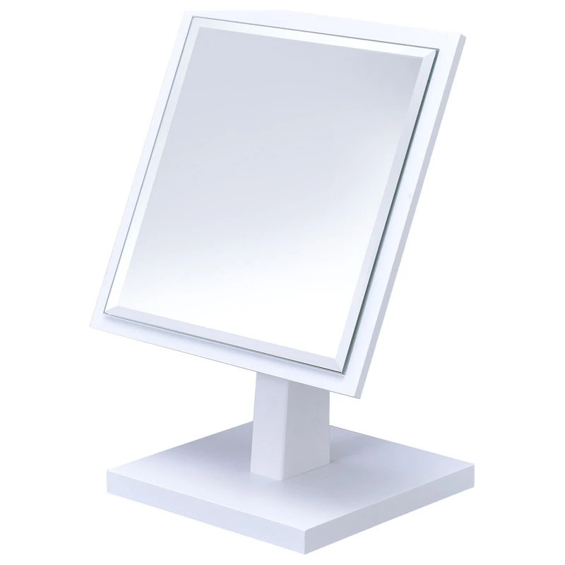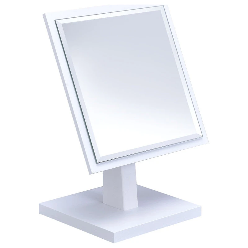 The Pretty White Square Make Up Vanity Mirror is a fashionable desktop mirror for easy and quick styling. The frame and stand are made of all-natural wood and veneers in a pretty, winter white color and feature a beveled square mirror. This chic modern mirror rotates 360-degrees making it ideal for trying on accessories, applying makeup, taking selfies, putting in contacts, or any other situations where a close up mirror is needed. Crisp and casually cool, this mirror will be a great addition to your bedroom, bathroom or desk. 9.5″H x 7″ W x 5.5″ D